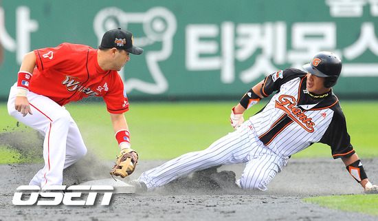 16일 오후 부산 사직구장서 열린 2011 롯데카드 프로야구 플레이오프 1차전 롯데 자이언츠와 SK 와이번스의 경기 2회말 2사 1루 상황 롯데 손아섭의 타석때 1루 주자 김주찬이 2루 도루해 세이프 되고 있다. 롯데는 예상대로 가장 컨디션이 좋았던 장원준을 그대로 PO 1차전 선발로 내세웠고, 준플레이오프를 4차전으로 끝내면서 전력을 아낀 SK는 김광현을 1차전 선발 마운드에 올렸다. 롯데는 양승호 감독이 시리즈를 3연승으로 끝내겠다는 자신감을 나타냈고, SK는 준PO에서 먼저 1승을 내주고 3연승으로 리버스 스윕을 이끈 상승세를 바탕으로 치열한 경기가 예상된다. / soul1014@osen.co.kr