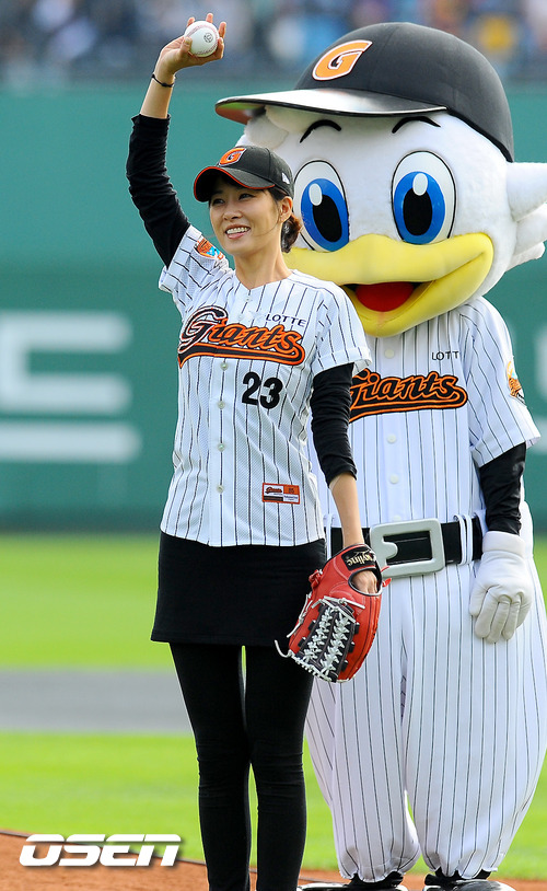16일 오후 부산 사직구장서 열린 2011 롯데카드 프로야구 플레이오프 1차전 롯데 자이언츠와 SK 와이번스의 경기 배우 김선아가 시구를 위해 팬들에게 인사를 하고 있다. 롯데는 예상대로 가장 컨디션이 좋았던 장원준을 그대로 PO 1차전 선발로 내세웠고, 준플레이오프를 4차전으로 끝내면서 전력을 아낀 SK는 김광현을 1차전 선발 마운드에 올렸다. 롯데는 양승호 감독이 시리즈를 3연승으로 끝내겠다는 자신감을 나타냈고, SK는 준PO에서 먼저 1승을 내주고 3연승으로 리버스 스윕을 이끈 상승세를 바탕으로 치열한 경기가 예상된다. / soul1014@osen.co.kr