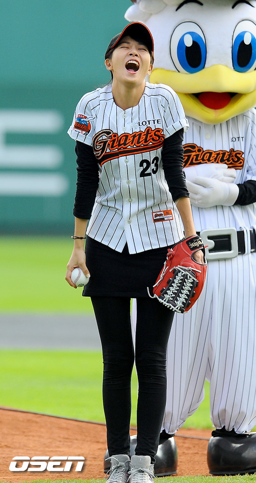 16일 오후 부산 사직구장서 열린 2011 롯데카드 프로야구 플레이오프 1차전 롯데 자이언츠와 SK 와이번스의 경기 배우 김선아가 시구 전 쑥스러운 표정을 짓고 있다. 롯데는 예상대로 가장 컨디션이 좋았던 장원준을 그대로 PO 1차전 선발로 내세웠고, 준플레이오프를 4차전으로 끝내면서 전력을 아낀 SK는 김광현을 1차전 선발 마운드에 올렸다. 롯데는 양승호 감독이 시리즈를 3연승으로 끝내겠다는 자신감을 나타냈고, SK는 준PO에서 먼저 1승을 내주고 3연승으로 리버스 스윕을 이끈 상승세를 바탕으로 치열한 경기가 예상된다. / soul1014@osen.co.kr