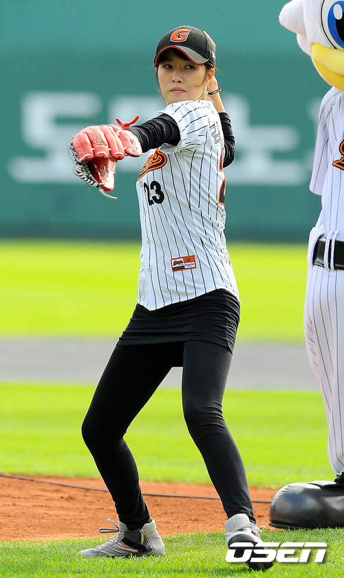 16일 오후 부산 사직구장서 열린 2011 롯데카드 프로야구 플레이오프 1차전 롯데 자이언츠와 SK 와이번스의 경기 전 배우 김선아가 시구를 하고 있다. 롯데는 예상대로 가장 컨디션이 좋았던 장원준을 그대로 PO 1차전 선발로 내세웠고, 준플레이오프를 4차전으로 끝내면서 전력을 아낀 SK는 김광현을 1차전 선발 마운드에 올렸다. 롯데는 양승호 감독이 시리즈를 3연승으로 끝내겠다는 자신감을 나타냈고, SK는 준PO에서 먼저 1승을 내주고 3연승으로 리버스 스윕을 이끈 상승세를 바탕으로 치열한 경기가 예상된다. / soul1014@osen.co.kr
