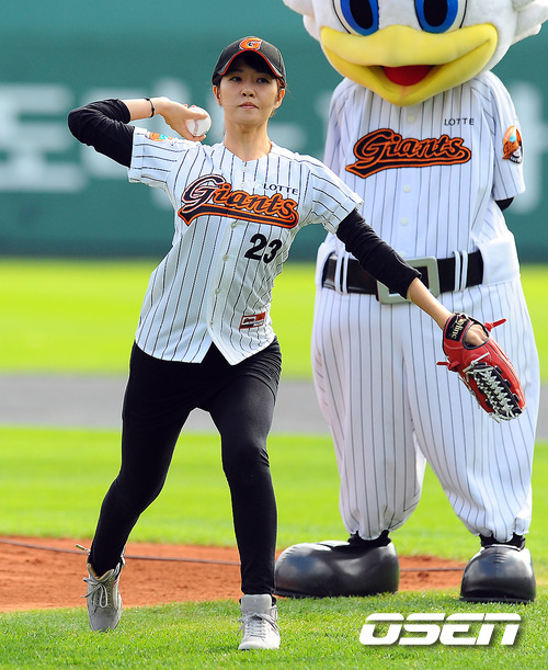 16일 오후 부산 사직구장서 열린 2011 롯데카드 프로야구 플레이오프 1차전 롯데 자이언츠와 SK 와이번스의 경기 전 배우 김선아가 시구를 하고 있다. 롯데는 예상대로 가장 컨디션이 좋았던 장원준을 그대로 PO 1차전 선발로 내세웠고, 준플레이오프를 4차전으로 끝내면서 전력을 아낀 SK는 김광현을 1차전 선발 마운드에 올렸다. 롯데는 양승호 감독이 시리즈를 3연승으로 끝내겠다는 자신감을 나타냈고, SK는 준PO에서 먼저 1승을 내주고 3연승으로 리버스 스윕을 이끈 상승세를 바탕으로 치열한 경기가 예상된다. / soul1014@osen.co.kr