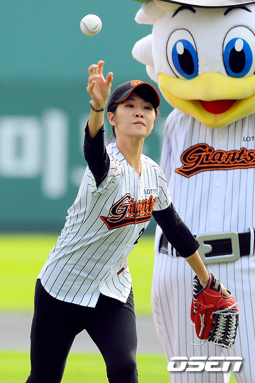 16일 오후 부산 사직구장서 열린 2011 롯데카드 프로야구 플레이오프 1차전 롯데 자이언츠와 SK 와이번스의 경기 전 배우 김선아가 시구를 하고 있다. 롯데는 예상대로 가장 컨디션이 좋았던 장원준을 그대로 PO 1차전 선발로 내세웠고, 준플레이오프를 4차전으로 끝내면서 전력을 아낀 SK는 김광현을 1차전 선발 마운드에 올렸다. 롯데는 양승호 감독이 시리즈를 3연승으로 끝내겠다는 자신감을 나타냈고, SK는 준PO에서 먼저 1승을 내주고 3연승으로 리버스 스윕을 이끈 상승세를 바탕으로 치열한 경기가 예상된다. / soul1014@osen.co.kr