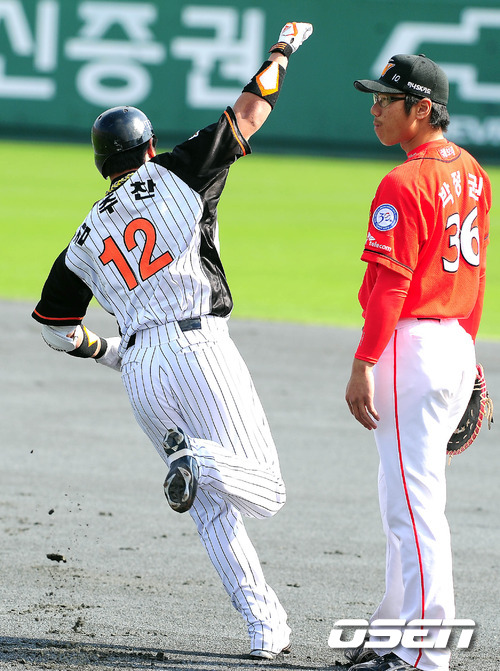 2011 롯데카드 프로야구 플레이오프 1차전 롯데 김주찬이 선두타자 홈런을 치고 SK 박정권 앞에서 주먹을 불끈 쥐고 있다. 16일 부산사직구장에서 롯데 자이언츠와 SK 와이번스의 플레이오프 1차전 경기가 벌어졌다. 롯데는 예상대로 가장 컨디션이 좋은 장원준을 그대로 PO 1차전 선발로 내세웠고, 준플레이오프를 4차전으로 끝내면서 전력을 아낀 SK는 김광현을 1차전 선발 마운드에 올렸다. 롯데는 양승호 감독이 시리즈를 3연승으로 끝내겠다는 자신감을 나타냈고, SK는 준PO에서 먼저 1승을 내주고 3연승으로 리버스 스윕을 이끈 상승세를 바탕으로 치열한 경기가 예상된다. /spjj@osen.co.kr