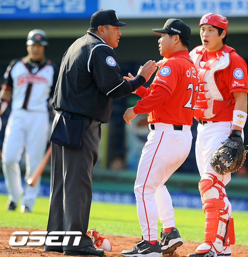 16일 오후 부산 사직구장서 열린 2011 롯데카드 프로야구 플레이오프 1차전 롯데 자이언츠와 SK 와이번스의 경기 4회말 1사 1루 상황 롯데 김주찬의 삼진아웃때 SK 이만수 감독대행이 그라운드로 나와 오석환 구심에게 항의하고 있다. 롯데는 예상대로 가장 컨디션이 좋았던 장원준을 그대로 PO 1차전 선발로 내세웠고, 준플레이오프를 4차전으로 끝내면서 전력을 아낀 SK는 김광현을 1차전 선발 마운드에 올렸다. 롯데는 양승호 감독이 시리즈를 3연승으로 끝내겠다는 자신감을 나타냈고, SK는 준PO에서 먼저 1승을 내주고 3연승으로 리버스 스윕을 이끈 상승세를 바탕으로 치열한 경기가 예상된다. / soul1014@osen.co.kr