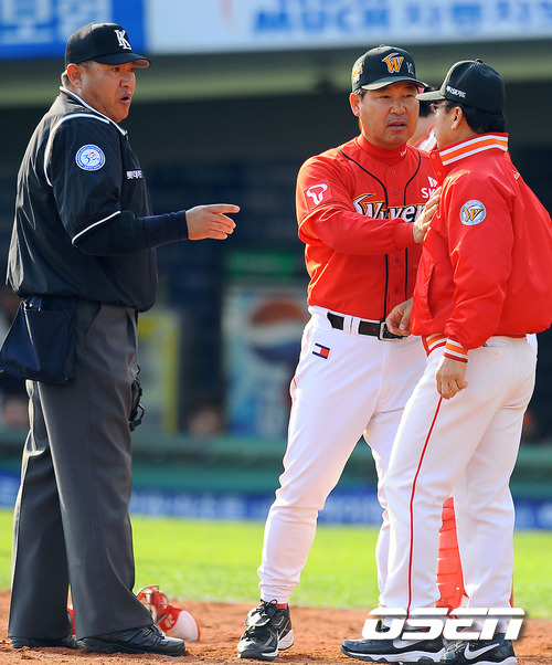16일 오후 부산 사직구장서 열린 2011 롯데카드 프로야구 플레이오프 1차전 롯데 자이언츠와 SK 와이번스의 경기 4회말 1사 1루 상황 롯데 김주찬의 삼진아웃때 SK 이만수 감독대행이 그라운드로 나와 오석환 구심에게 항의한 뒤 이철성 수석코치를 달래며 더그아웃으로 들어가고 있다. 롯데는 예상대로 가장 컨디션이 좋았던 장원준을 그대로 PO 1차전 선발로 내세웠고, 준플레이오프를 4차전으로 끝내면서 전력을 아낀 SK는 김광현을 1차전 선발 마운드에 올렸다. 롯데는 양승호 감독이 시리즈를 3연승으로 끝내겠다는 자신감을 나타냈고, SK는 준PO에서 먼저 1승을 내주고 3연승으로 리버스 스윕을 이끈 상승세를 바탕으로 치열한 경기가 예상된다. / soul1014@osen.co.kr