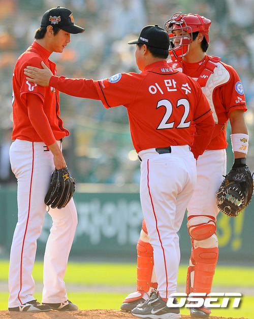 16일 오후 부산 사직구장서 열린 2011 롯데카드 프로야구 플레이오프 1차전 롯데 자이언츠와 SK 와이번스의 경기 4회말 롯데 전준우에게 1실점 허용한 SK 이만수 감독대행이 김광현 선발투수를 강판하고 시키고 있다. 롯데는 예상대로 가장 컨디션이 좋았던 장원준을 그대로 PO 1차전 선발로 내세웠고, 준플레이오프를 4차전으로 끝내면서 전력을 아낀 SK는 김광현을 1차전 선발 마운드에 올렸다. 롯데는 양승호 감독이 시리즈를 3연승으로 끝내겠다는 자신감을 나타냈고, SK는 준PO에서 먼저 1승을 내주고 3연승으로 리버스 스윕을 이끈 상승세를 바탕으로 치열한 경기가 예상된다. / soul1014@osen.co.kr