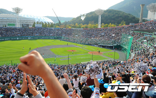 2011 롯데카드 프로야구 플레이오프 1차전 부산사직구장을 가득 메운 관객들이 열띤 응원을 펼치고 있다. 16일 부산사직구장에서 롯데 자이언츠와 SK 와이번스의 플레이오프 1차전 경기가 벌어졌다. 롯데는 예상대로 가장 컨디션이 좋은 장원준을 그대로 PO 1차전 선발로 내세웠고, 준플레이오프를 4차전으로 끝내면서 전력을 아낀 SK는 김광현을 1차전 선발 마운드에 올렸다. 롯데는 양승호 감독이 시리즈를 3연승으로 끝내겠다는 자신감을 나타냈고, SK는 준PO에서 먼저 1승을 내주고 3연승으로 리버스 스윕을 이끈 상승세를 바탕으로 치열한 경기가 예상된다. / sunday@osen.co.kr