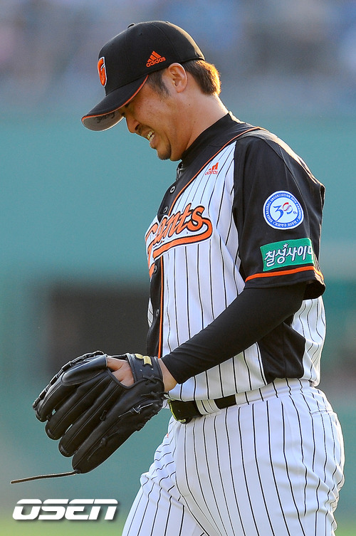 16일 오후 부산 사직구장서 열린 2011 롯데카드 프로야구 플레이오프 1차전 롯데 자이언츠와 SK 와이번스의 경기 6회초 1사 SK 정근우의 내야땅볼을 롯데 임경완 투수가 놓친 후 아쉬운 표정을 짓고 있다. 롯데는 예상대로 가장 컨디션이 좋았던 장원준을 그대로 PO 1차전 선발로 내세웠고, 준플레이오프를 4차전으로 끝내면서 전력을 아낀 SK는 김광현을 1차전 선발 마운드에 올렸다. 롯데는 양승호 감독이 시리즈를 3연승으로 끝내겠다는 자신감을 나타냈고, SK는 준PO에서 먼저 1승을 내주고 3연승으로 리버스 스윕을 이끈 상승세를 바탕으로 치열한 경기가 예상된다. / soul1014@osen.co.kr