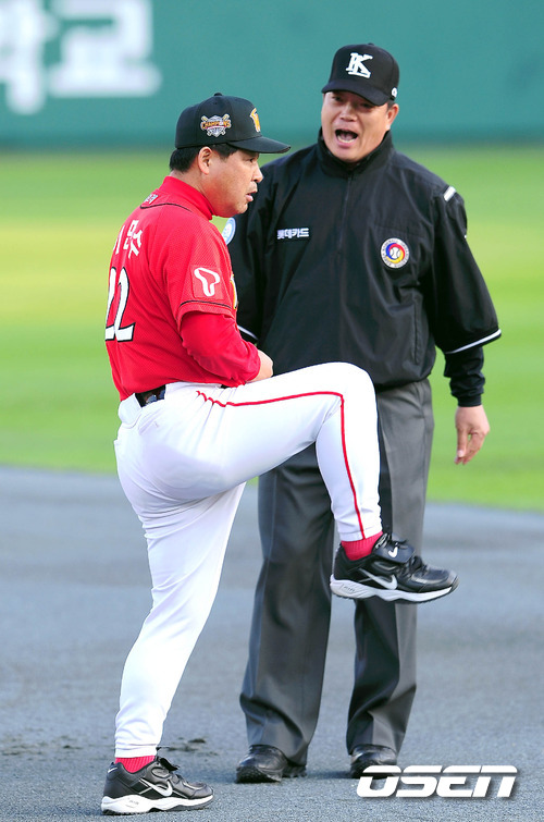 2011 롯데카드 프로야구 플레이오프 1차전 롯데 6회말 1사 1루 SK 박희수 투수가 손아섭을 상대로 투수 보크를 범하자 이만수 감독이 문승훈 1루심에게 달려가 항의하고 있다. 16일 부산사직구장에서 롯데 자이언츠와 SK 와이번스의 플레이오프 1차전 경기가 벌어졌다. 롯데는 예상대로 가장 컨디션이 좋은 장원준을 그대로 PO 1차전 선발로 내세웠고, 준플레이오프를 4차전으로 끝내면서 전력을 아낀 SK는 김광현을 1차전 선발 마운드에 올렸다. 롯데는 양승호 감독이 시리즈를 3연승으로 끝내겠다는 자신감을 나타냈고, SK는 준PO에서 먼저 1승을 내주고 3연승으로 리버스 스윕을 이끈 상승세를 바탕으로 치열한 경기가 예상된다. /spjj@osen.co.kr