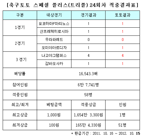 축구토토 스페셜 플러스 24회차 적중결과… 트리플 배당 1만6천543.3배 나와 J리그 경기를 대상으로 하는 축구토토 스페셜 플러스 24회차(트리플) 에서 총 195명의 적중자가 나왔다. 국민체육진흥공단이 발행하는 체육진흥 투표권 수탁사업자인 스포츠토토(www.sportstoto.co.kr)는 지난 15일(토) 열린 요코하마F마리노스-산프레체히로시마(1경기), 우라와레드-오미야아르디자(2경기), 나고야그램퍼스-감바오사카(3경기) 등 J리그 세 경기를 대상으로 시행한 축구토토 스페셜 플러스 24회차 트리플 게임에서 세 경기의 최종 점수대를 정확히 맞힌 적중자가 총 195명 나와 각각 베팅 금액의 1만6천543.3배에 해당하는 적중상금을 받게 됐다고 밝혔다. 1경기 요코하마F마리노스-산프레체히로시마(1-1 무승부), 2경기 우라와레드-오미야아르디자(0-1 오미야아르디자 승리), 3경기 나고야그램퍼스-감바오사카 (4-1 나고야그램퍼스 승리)등 세 경기의 최종 점수대를 알아맞히는 방식(트리플)으로 시행된 이번 회차에서 적중자 가운데 1천원을 베팅한 1명의 축구팬은 이번 회차 최고액인 1천654만 3천300원의 적중상금을 가져가게 됐다. 최소 베팅금액인 100원을 건 51명의 적중자들에게는 각각 165만 4천330원씩 돌아간다.