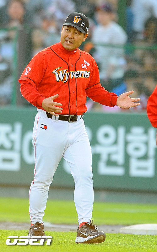 16일 오후 부산 사직구장서 열린 2011 롯데카드 프로야구 플레이오프 1차전 롯데 자이언츠와 SK 와이번스의 경기 6회말 1사 1루 상황 롯데 손아섭의 타석때 SK 박희수 투수가 보크판정을 받았다. 이에 이만수 감독대행이 문승훈 1루심에게 항의하고 있다. 롯데는 예상대로 가장 컨디션이 좋았던 장원준을 그대로 PO 1차전 선발로 내세웠고, 준플레이오프를 4차전으로 끝내면서 전력을 아낀 SK는 김광현을 1차전 선발 마운드에 올렸다. 롯데는 양승호 감독이 시리즈를 3연승으로 끝내겠다는 자신감을 나타냈고, SK는 준PO에서 먼저 1승을 내주고 3연승으로 리버스 스윕을 이끈 상승세를 바탕으로 치열한 경기가 예상된다. / soul1014@osen.co.kr