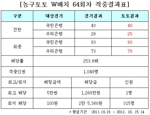 국민은행-우리은행전 대상 W매치 64회차 게임… 1천49명 무더기 적중. 국민은행, 우리은행에 승리 거둬 국민은행-우리은행전을 대상으로 한 농구토토 W매치 게임에서 1천49명의 적중자가 나왔다. 국민체육진흥공단이 발행하는 체육진흥 투표권 수탁사업자인 스포츠토(www.sportstoto.co.kr)는 지난 15일(토) 오후에 벌어진 2011-2012시즌 여자프로농구(WKBL) 국민은행-우리은행전을 대상으로 한 농구토토 W매치 64회차에서 모두 1,049명의 농구팬이 경기 결과를 정확히 맞혀 각각 베팅금액의 253.6배에 달하는 적중상금을 받게 됐다고 밝혔다. 농구토토W매치는 한국여자농구연뱅에서 주최하는 국내여자프로농구 경기를 대상으로 전반득점대(1+2쿼터)와 최종득점대(1+2쿼터, 연장전포함)를 맞히는 게임이다. 이번 회차에서는 1+2쿼터(국민은행 45-25 우리은행)과 1+2쿼터 포함 최종 점수대(국민은행 80-70 우리은행)를 정확히 맞힌 이들 적중자들 가운데 5만원을 베팅한 1명에게는 이번 회차 최고 상금인 1천268만원의 적중상금이 지급된다. 최소 베팅액인 100원을 베팅한 315명에게는 각각 2만 5천360원씩이 돌아간다. 한편, 농구토토W매치 66회차 경기는 17일(월) 춘천호반체육관에서 열리는 우리은행과 신세계의 경기를 대상으로 발매될 예정이다.