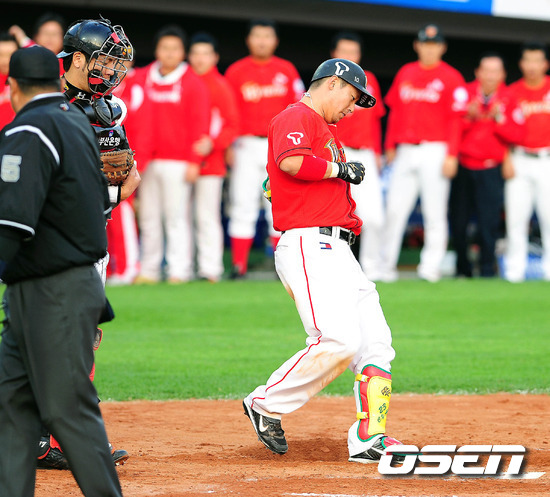 2011 롯데카드 프로야구 플레이오프 1차전 SK 7회초 1사 1루 안치용이 좌측 담장을 넘어가는 투런 홈런을 치고 홈베이스를 지나쳐 그냥 들어오다 이만수 감독이 황급하게 제지하자 다시 돌아가 홈베이스를 밟고 있다. 16일 부산사직구장에서 롯데 자이언츠와 SK 와이번스의 플레이오프 1차전 경기가 벌어졌다. 롯데는 예상대로 가장 컨디션이 좋은 장원준을 그대로 PO 1차전 선발로 내세웠고, 준플레이오프를 4차전으로 끝내면서 전력을 아낀 SK는 김광현을 1차전 선발 마운드에 올렸다. 롯데는 양승호 감독이 시리즈를 3연승으로 끝내겠다는 자신감을 나타냈고, SK는 준PO에서 먼저 1승을 내주고 3연승으로 리버스 스윕을 이끈 상승세를 바탕으로 치열한 경기가 예상된다. /spjj@osen.co.kr