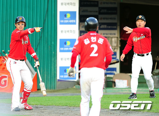 2011 롯데카드 프로야구 플레이오프 1차전 SK 7회초 1사 1루 안치용이 좌측 담장을 넘어가는 투런 홈런을 치고 홈베이스를 안밟고 오자 김강민과 이만수 감독이 황급하게 지적을 해주고 있다. 16일 부산사직구장에서 롯데 자이언츠와 SK 와이번스의 플레이오프 1차전 경기가 벌어졌다. 롯데는 예상대로 가장 컨디션이 좋은 장원준을 그대로 PO 1차전 선발로 내세웠고, 준플레이오프를 4차전으로 끝내면서 전력을 아낀 SK는 김광현을 1차전 선발 마운드에 올렸다. 롯데는 양승호 감독이 시리즈를 3연승으로 끝내겠다는 자신감을 나타냈고, SK는 준PO에서 먼저 1승을 내주고 3연승으로 리버스 스윕을 이끈 상승세를 바탕으로 치열한 경기가 예상된다. /spjj@osen.co.kr