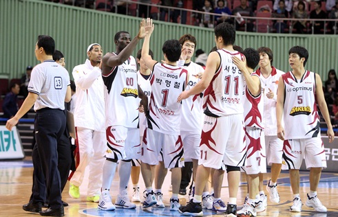 '문코비' 문태영(LG)이 복수아뼈쪽 타박상으로 인해 삼성과 경기에 출전하지 않았다. LG는 16일 잠실실내체육관서 열린 2011-2012 KB국민카드 프로농구서 삼성과 경기서 81-74으로 승리했다. LG는 2승, 삼성은 1승 1패를 마크했다. 서장훈은 23점, 오용준은 3점슛 3개를 포함해 22점을 올렸고 오예데지는 13점, 23리바운드로 맹활약을 했다. 지난 15일 모비스와 홈개막전서 29점, 3스틸을 기록하며 팀 승리를 이끄는 문태영은 이날 출전하지 않았다. 경기 후 김진 감독은 "문태영은 15일 경기서 복숭아뼈쪽에 타박상 입었다. 심각한 것은 아니다. 선수 본인이 통증을 느껴 삼성전서는 투입하지 않았다"고 설명했다. LG는 문태영이 뛰지 못했지만 서장훈(23점)과 오용준(22점)이 풀타임을 소화하고 박형철, 정창영, 전형수, 오용준이 경기에 나서 역전승을 거뒀다. 김진 감독은 "이제 막 시즌이 시작됐다. 앞으로 경기가 많이 남아있기 때문에 국내 선수들에게 기회를 주는 것도 중요하다"며 문태영에 휴식을 준 이유를 설명했다. ball@osen.co.kr KBL 제공.