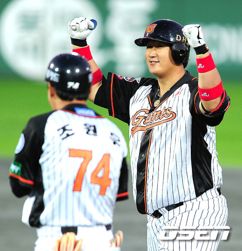 2011 롯데카드 프로야구 플레이오프 1차전 롯데 8회말 2사 2루 이대호가 동점 적시타를 치고 환호하고 있다. 16일 부산사직구장에서 롯데 자이언츠와 SK 와이번스의 플레이오프 1차전 경기가 벌어졌다. 롯데는 예상대로 가장 컨디션이 좋은 장원준을 그대로 PO 1차전 선발로 내세웠고, 준플레이오프를 4차전으로 끝내면서 전력을 아낀 SK는 김광현을 1차전 선발 마운드에 올렸다. 롯데는 양승호 감독이 시리즈를 3연승으로 끝내겠다는 자신감을 나타냈고, SK는 준PO에서 먼저 1승을 내주고 3연승으로 리버스 스윕을 이끈 상승세를 바탕으로 치열한 경기가 예상된다. /spjj@osen.co.kr