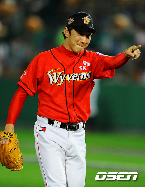 16일 오후 부산 사직구장서 열린 2011 롯데카드 프로야구 플레이오프 1차전 롯데 자이언츠와 SK 와이번스의 경기 9회말 1사 만루 상황에서 롯데 손아섭을 병살아웃한 SK 정우람 투수가 환호하며 더그아웃으로 들어가고 있다. 롯데는 예상대로 가장 컨디션이 좋았던 장원준을 그대로 PO 1차전 선발로 내세웠고, 준플레이오프를 4차전으로 끝내면서 전력을 아낀 SK는 김광현을 1차전 선발 마운드에 올렸다. 롯데는 양승호 감독이 시리즈를 3연승으로 끝내겠다는 자신감을 나타냈고, SK는 준PO에서 먼저 1승을 내주고 3연승으로 리버스 스윕을 이끈 상승세를 바탕으로 치열한 경기가 예상된다. / soul1014@osen.co.kr