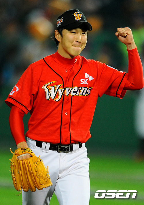 16일 오후 부산 사직구장서 열린 2011 롯데카드 프로야구 플레이오프 1차전 롯데 자이언츠와 SK 와이번스의 경기 9회말 1사 만루 상황에서 롯데 손아섭을 병살아웃한 SK 정우람 투수가 환호하며 더그아웃으로 들어가고 있다. 롯데는 예상대로 가장 컨디션이 좋았던 장원준을 그대로 PO 1차전 선발로 내세웠고, 준플레이오프를 4차전으로 끝내면서 전력을 아낀 SK는 김광현을 1차전 선발 마운드에 올렸다. 롯데는 양승호 감독이 시리즈를 3연승으로 끝내겠다는 자신감을 나타냈고, SK는 준PO에서 먼저 1승을 내주고 3연승으로 리버스 스윕을 이끈 상승세를 바탕으로 치열한 경기가 예상된다. / soul1014@osen.co.kr