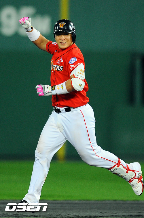 16일 오후 부산 사직구장서 열린 2011 롯데카드 프로야구 플레이오프 1차전 롯데 자이언츠와 SK 와이번스의 경기 10회초 SK 선두타자 정상호가 역전 솔로홈런을 날린 후 환호하고 있다. 롯데는 예상대로 가장 컨디션이 좋았던 장원준을 그대로 PO 1차전 선발로 내세웠고, 준플레이오프를 4차전으로 끝내면서 전력을 아낀 SK는 김광현을 1차전 선발 마운드에 올렸다. 롯데는 양승호 감독이 시리즈를 3연승으로 끝내겠다는 자신감을 나타냈고, SK는 준PO에서 먼저 1승을 내주고 3연승으로 리버스 스윕을 이끈 상승세를 바탕으로 치열한 경기가 예상된다. / soul1014@osen.co.kr
