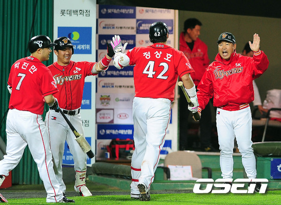 2011 롯데카드 프로야구 플레이오프 1차전 SK 10회초 무사 정상호가 좌월 솔로홈런을 치고 동료들의 환영을 받고 있다. 16일 부산사직구장에서 롯데 자이언츠와 SK 와이번스의 플레이오프 1차전 경기가 벌어졌다. 롯데는 예상대로 가장 컨디션이 좋은 장원준을 그대로 PO 1차전 선발로 내세웠고, 준플레이오프를 4차전으로 끝내면서 전력을 아낀 SK는 김광현을 1차전 선발 마운드에 올렸다. 롯데는 양승호 감독이 시리즈를 3연승으로 끝내겠다는 자신감을 나타냈고, SK는 준PO에서 먼저 1승을 내주고 3연승으로 리버스 스윕을 이끈 상승세를 바탕으로 치열한 경기가 예상된다. /spjj@osen.co.kr