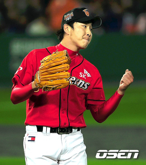 시작부터 연장 혈투다. 준플레이오프를 넘어선 SK 와이번스가 플레이오프에서도 그 기세를 멈추지 않았다. SK는 16일 사직구장에서 열린 2011 롯데카드 프로야구 플레이오프 1차전 롯데와의 원정경기에서 연장 10회 터진 정상호의 짜릿한 결승포를 앞세워 7-6의 짜릿한 재역전승에 성공했다. 6-6으로 팽팽하게 맞선 연장 10회초 선두타자로 나선 정상호는 롯데 부첵의 2구째 직구(142km)를 통타, 좌측 담장을 훌쩍 넘겼다. 이번 포스트시즌 첫 홈런포(통산 4번째)다. 이로써 SK는 3선승제 플레이오프 첫 판을 승리로 장식, 유리한 고지에 올라섰다. 반면 롯데는 지난 1999년 10월 22일 한화와의 한국시리즈 1차전 3-6 패배 이후 홈경기 12연패에 빠졌다. 승리의 1등공신 정우람이 승리가 확정되는 순간 주먹을 불끈 쥐고 있다. /spjj@osen.co.kr