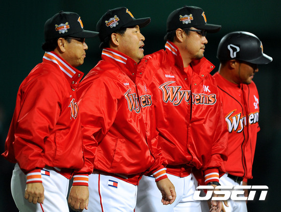 6일 오후 부산 사직구장에서 2011 롯데카드 프로야구 플레이오프 1차전 롯데 자이언츠와 SK 와이번스의 경기가 열렸다. 시작부터 연장 혈투였다. 양팀 모두 한치 양보없는 반전에반전 경기 끝에 SK가 연장 10회에 터진 정상호의 짜릿한 결승포를 앞세워 7-6의 짜릿한 재역전승에 성공했다. 6-6으로 팽팽하게 맞선 연장 10회초 선두타자로 나선 정상호는 롯데 부첵의 2구째 직구(142km)를 통타, 좌측 담장을 훌쩍 넘겼다. 이번 포스트시즌 첫 홈런포(통산 4번째)다. 이로써 SK는 3선승제 플레이오프 첫 판을 승리로 장식, 유리한 고지에 올라섰다. 반면 롯데는 지난 1999년 10월 22일 한화와의 한국시리즈 1차전 3-6 패배 이후 홈경기 12연패에 빠졌다 한편 프로야구 플레이오프는 5전 3선승제로 진행되며 17일 오후6시에 사직구장에서 2차전 경기를 갖게 된다. 경기종료 후 SK 이만수 감독대행이 안도의 한숨을 쉬며 승리의기쁨을 나누고 있다. /soul1014@osen.co.kr