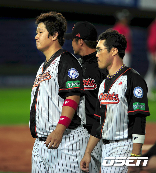 시작부터 연장 혈투다. 준플레이오프를 넘어선 SK 와이번스가 플레이오프에서도 그 기세를 멈추지 않았다. SK는 16일 사직구장에서 열린 2011 롯데카드 프로야구 플레이오프 1차전 롯데와의 원정경기에서 연장 10회 터진 정상호의 짜릿한 결승포를 앞세워 7-6의 짜릿한 재역전승에 성공했다. 6-6으로 팽팽하게 맞선 연장 10회초 선두타자로 나선 정상호는 롯데 부첵의 2구째 직구(142km)를 통타, 좌측 담장을 훌쩍 넘겼다. 이번 포스트시즌 첫 홈런포(통산 4번째)다. 이로써 SK는 3선승제 플레이오프 첫 판을 승리로 장식, 유리한 고지에 올라섰다. 반면 롯데는 지난 1999년 10월 22일 한화와의 한국시리즈 1차전 3-6 패배 이후 홈경기 12연패에 빠졌다. 롯데 이대호와 조성환이 아쉬운 표정으로 경기장을 빠져 나가고 있다. /spjj@osen.co.kr
