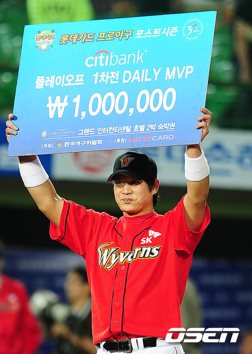 시작부터 연장 혈투다. 준플레이오프를 넘어선 SK 와이번스가 플레이오프에서도 그 기세를 멈추지 않았다. SK는 16일 사직구장에서 열린 2011 롯데카드 프로야구 플레이오프 1차전 롯데와의 원정경기에서 연장 10회 터진 정상호의 짜릿한 결승포를 앞세워 7-6의 짜릿한 재역전승에 성공했다. 6-6으로 팽팽하게 맞선 연장 10회초 선두타자로 나선 정상호는 롯데 부첵의 2구째 직구(142km)를 통타, 좌측 담장을 훌쩍 넘겼다. 이번 포스트시즌 첫 홈런포(통산 4번째)다. 이로써 SK는 3선승제 플레이오프 첫 판을 승리로 장식, 유리한 고지에 올라섰다. 반면 롯데는 지난 1999년 10월 22일 한화와의 한국시리즈 1차전 3-6 패배 이후 홈경기 12연패에 빠졌다. 승리의 1등공신 정우람이 데일리 MVP에 뽑혔다. /spjj@osen.co.kr 시작부터 연장 혈투다. 준플레이오프를 넘어선 SK 와이번스가 플레이오프에서도 그 기세를 멈추지 않았다. SK는 16일 사직구장에서 열린 2011 롯데카드 프로야구 플레이오프 1차전 롯데와의 원정경기에서 연장 10회 터진 정상호의 짜릿한 결승포를 앞세워 7-6의 짜릿한 재역전승에 성공했다. 6-6으로 팽팽하게 맞선 연장 10회초 선두타자로 나선 정상호는 롯데 부첵의 2구째 직구(142km)를 통타, 좌측 담장을 훌쩍 넘겼다. 이번 포스트시즌 첫 홈런포(통산 4번째)다. 이로써 SK는 3선승제 플레이오프 첫 판을 승리로 장식, 유리한 고지에 올라섰다. 반면 롯데는 지난 1999년 10월 22일 한화와의 한국시리즈 1차전 3-6 패배 이후 홈경기 12연패에 빠졌다. 승리의 1등공신 정우람이 데일리 MVP에 뽑혔다. /spjj@osen.co.kr
