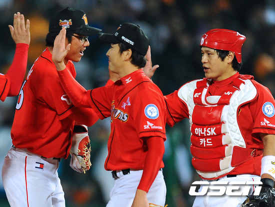 6일 오후 부산 사직구장에서 2011 롯데카드 프로야구 플레이오프 1차전 롯데 자이언츠와 SK 와이번스의 경기가 열렸다. 시작부터 연장 혈투였다. 양팀 모두 한치 양보없는 반전에반전 경기 끝에 SK가 연장 10회에 터진 정상호의 짜릿한 결승포를 앞세워 7-6의 짜릿한 재역전승에 성공했다. 6-6으로 팽팽하게 맞선 연장 10회초 선두타자로 나선 정상호는 롯데 부첵의 2구째 직구(142km)를 통타, 좌측 담장을 훌쩍 넘겼다. 이번 포스트시즌 첫 홈런포(통산 4번째)다. 이로써 SK는 3선승제 플레이오프 첫 판을 승리로 장식, 유리한 고지에 올라섰다. 반면 롯데는 지난 1999년 10월 22일 한화와의 한국시리즈 1차전 3-6 패배 이후 홈경기 12연패에 빠졌다 한편 프로야구 플레이오프는 5전 3선승제로 진행되며 17일 오후6시에 사직구장에서 2차전 경기를 갖게 된다. 경기종료 후 SK 정우람 투수와 정상호 포수가 악수를 나누며 승리의 기쁨을 나누고 있다. /soul1014@osen.co.kr