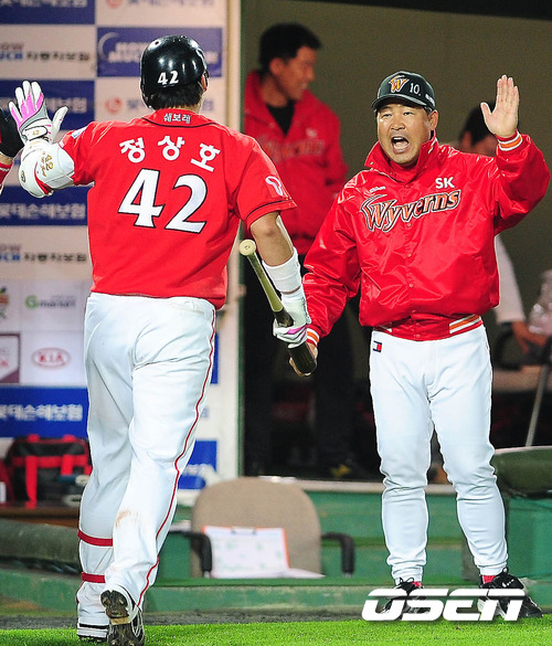 "이런 드라마는 몇 번 없었다". 벌써 포스트시즌 4연승 째다. SK 와이번스가 적지에서 천신만고 끝에 승리를 수확하고 1승을 선취했다. SK는 16일 사직구장에서 벌어진 '2011 롯데카드 프로야구' 롯데 자이언츠와의 플레이오프 1차전에서 6-6으로 맞선 연장 10회초 터진 정상호의 결승 솔로포에 힘입어 7-6으로 한 점차 승리를 거뒀다. 경기가 끝난 뒤 SK 이만수(53) 감독대행은 공식 기자회견에서 "감독 대행 하면서 이런 경기는 처음"이라며 "오늘 같은 경기는 정말 드라마다"라고 벅찬 감격을 전했다. 이어 이 감독대행은 "오늘은 부인과의 결혼 기념일"이라면서 "귀국 후 지난 5년 간 한 번도 못 챙겨서 미안했다. 무조건 승리를 선사하고 싶었는데 이렇게 이겨서 얼마나 좋은 지 모르겠다"고 기뻐했다. 끝으로 선수에 대한 당부도 잊지 않았다. 이 감독대행은 "큰 경기라 그런지 선수들이 긴장한 모습이 아직 보인다. 덕아웃에서 장난치고 웃게 하는 이유가 바로 선수들을 편하게 해 주려고 하는 것"이라며 "긴장하면 기량 발휘를 못 한다"고 편하게 경기에 임해 줄 것을 주문했다. cleanupp@osen.co.kr 부산=손용호 기자,spjj@osen.co.kr