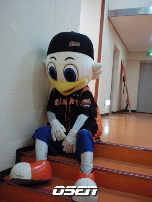 16일 사직구장에서 벌어진 롯데 자이언츠와 SK 와이번스의 플레이오프 1차전은 SK의 7-6, 한 점차 승리로 끝났습니다. 롯데 입장에서는 9회말 1사 만루의 끝내기 기회를 놓친 게 뼈아팠는데요. 손아섭의 타구가 병살로 이어졌고 결국 연장 10회초 정상호에게 솔로 홈런을 얻어맞으며 배하고 말았습니다. 포스트시즌 때는 정해진 장소에서 승장, 패장, 수훈선수 인터뷰를 공동으로 진행합니다. 결국 연장 10회말 롯데가 만회점을 내지 못하고 경기가 그대로 마무리된 후 인터뷰실로 향하던 도중에 롯데의 캐릭터, 누리를 만났습니다. 보시는 그대로 누리는 온 몸의 힘이 빠진 듯 낙담하며 계단에 걸터앉아 있었는데요. 비록 표정변화가 없는 인형의 탈을 썼지만 누리의 좌절, 낙담, 실망, 분노, 회한, 결의 등을 읽을 수 있었습니다. 비록 롯데가 아쉽게 패했지만 이제 1차전이 끝났을 뿐입니다. 누리도 플레이오프 2차전에는 다시 일어나겠죠? /신천옹