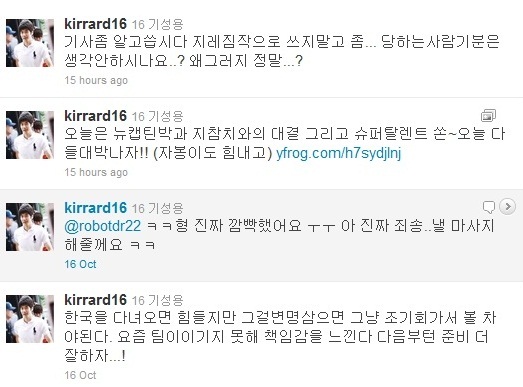'기라드' 기성용(22, 셀틱)이 트위터를 통해 최근 폴란드와 평가전 및 아랍에미리트연합(UAE)과 월드컵 예선을 위해 서울 다녀와 주말 리그 경기를 치른 뒤 자신의 소회를 올렸다. 기성용은 지난 16일 자신의 트위터에 "한국을 다녀오면 힘들지만 그걸 변명 삼으면 그냥 조기(축구)회 가서 공 차야 된다. 요즘 팀이 이기지 못해 책임감을 느낀다. 다음부터는 준비 더 잘하자"는 글을 올렸다. 기성용이 트위터에 올린 글은 마치 후배 손흥민(19, 함부르크)을 지칭한 것으로 해석돼 일부 매체에서 기사화 됐지만 기성용은 손흥민에게 한 말이 아닌 자신의 생각을 적은 것임을 분명히 했다. 기성용은 "지레 짐작으로 기사를 쓰지 말자. 당하는 사람 기분은 생각 안 하시나요?"라며 손흥민의 이름은 전혀 언급하지 않았다. 손흥민의 부친인 손웅정은 12일 인천공항서 가진 인터뷰서 "현재 (손)흥민이의 능력이 완벽하지 않다. 그렇기 때문에 즉시 전력이 된 다음 합류했으면 좋겠다"면서 "만약 손흥민이 없을 때 대표팀의 전술이 돌아가지 않는다면 그때 불러줬으면 좋겠다"는 말을 해 논란을 일으켰다. 기성용은 또 16일 밤 박주영이 소속된 아스날과 지동원이 활약하는 선덜랜드의 맞대결을 앞두고 "뉴캡틴박과 지참치와의 대결, 그리고 슈퍼 탈렌트 쏜~ 오늘 다들 대박나자"는 글을 통해 동료들에 대한 응원과 애정을 전했다. ball@osen.co.kr 기성용 트위터 캡처.
