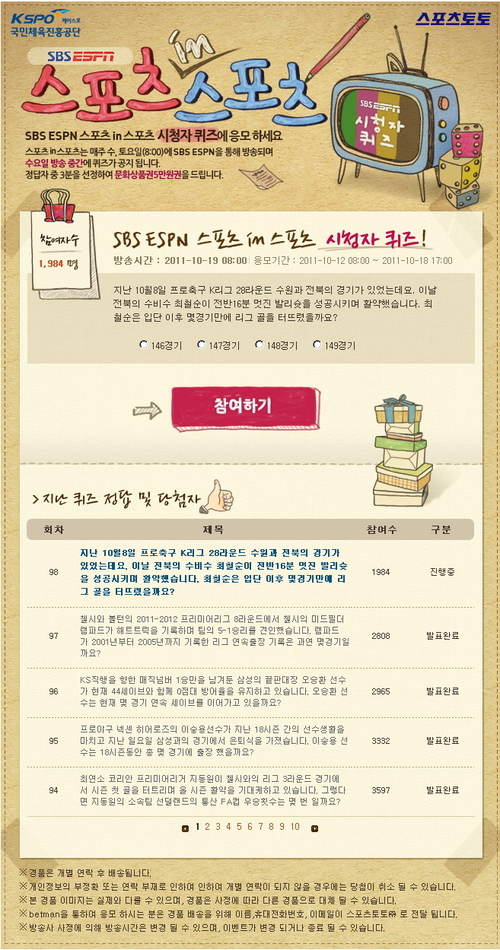 국민체육진흥공단(www.kspo.or.kr)이 발행하는 체육진흥 투표권 수탁사업자인 스포츠토토(www.sportstoto.co.kr)의 인기상품 고정배당률게임 프로토의 정보제공 프로그램 SBS ESPN '스포츠인스포츠'에서 매주 출제되고 있는 시청자 퀴즈에 프로토 마니아를 비롯한 스포츠팬들의 뜨거운 참여 행진이 이어지고 있다. '스포츠인스포츠'는 프로토 관련 정보와 함께 다양한 스포츠 소식을 전달하는 프로그램이며, 매주 수요일과 토요일 오전 8시에 스포츠전문 채널인 SBS ESPN을 통해 방송되고 있다. 매주 수요일 방송을 통해 공개되는 시청자 퀴즈의 정답을 맞힌 회원들에게는 추첨을 통해 총 3명에게 다양한 문화 혜택을 누릴 수 있는 문화상품권 5만원권이 증정된다. 이번 주에는 지난 10월 8일 국내프로축구 K리그 수원삼성-전북현대전에서 멋진 발리슛을 성공시킨 최철순이 입단 이후 몇 경기만에 득점했는지를 맞히는 퀴즈가 출제됐다. 공격의 핵 이동국이 빠졌던 전북은 최철순의 멋진 선제골로 경기 초반 앞서나갔지만, 상대팀 수원과 치열한 공방전 끝에 2대2 무승부를 기록하며 경기를 마쳤다. 한편, 이번 퀴즈에 참여하기를 원하는 스포츠팬은 스포츠토토 공식온라인 발매사이트인 베트맨(www.betman.co.kr)의 이벤트 코너를 방문하면 된다. 이번 시청자 퀴즈는 18일(화) 오후 5시까지 참여가 가능하다.