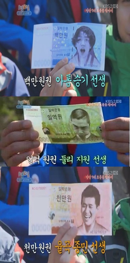 '1박2일' 멤버들의 얼굴이 그려진 가짜 지폐가 화제다. 17일 온라인에는 지난 16일 방송된 KBS 2TV 주말 버라이어티 '해피선데이-1박2일'에 등장했던 '1박2일'판 지폐 관련 기사와 게시물들이 네티즌의 폭풍 클릭을 받고 있다. '1박2일' 지폐, 이승기 지폐 등과 같은 단어들이 검색어 상위권에 오르며 큰 관심을 입증했다. '1박2일'은 16일 방송된 '경주 답사여행' 편에서 멤버들은 코스에 동행한 유홍준 교수('나의 문화유산 답사기' 저자)가 내는 퀴즈를 맞히면 자신들의 얼굴이 그려진 가짜 지폐를 상금(용돈)으로 지급받을 수 있었다. 백만원권에는 이승기, 천만원 권에는 김종민, 일억원 권에는 은지원, 십억원 권에는 이수근, 백억원 권에는 엄태웅의 우스꽝스러운 얼굴이 그려져 있어 폭소를 자아냈다. 그렇게 모은 상금으로 제작진이 직접 마련한 간이 매점에서 김밥 한 줄에 30억, 초콜릿 한 알에 1억을 지불하고 '황당한 점심식사'를 해결해야 했다. 멤버들은 자신들의 얼굴이 그려진 지폐를 받고는 황당한 듯 웃음을 터무니없는 가격에 김밥과 음료수, 간식거리를 사야 하는 지경이 되자 혀를 내둘렀다. 이러한 멤버들의 모습은 시청자들을 폭소케 했다. 방송 후 시청자 게시판과 각종 온라인 커뮤니티에는 이날 등장한 '1박2일'판 얼굴 지폐를 캡처한 사진과 게시물이 떠돌았다. 그렇다면 이 기발하고 재미있는 지폐들은 어떻게 만들어졌을까. '1박2일' 제작진 한 관계자는 17일 OSEN과의 전화통화에서 "녹화에 앞서 제작진이 사전 답사를 갔을 때 남산 정상에 오르니 배가 고프고 목이 심하게 마르더라"며 "그래서 우리들만의 매점을 만들어서 먹을거리들을 팔면 좋겠다고 생각했다. 이왕이면 비싼 가격으로 설정해 재미있는 상황이 연출되길 바랐다. 그 과정에서 자연스럽게 가짜 지폐를 만들어보면 어떨까 생각을 하게 됐다"고 말했다. 가짜 지폐가 탄생하기까지는 소품팀의 노력이 필요했다. 관계자는 "소품팀에서 멤버들의 우스꽝스러운 사진을 모아 업체로 가져갔다. 얼굴을 넣은 디자인과 크기, 액수 등을 자세히 설명해 지폐 제작을 의뢰했다"며 "평소 예능 프로그램에 등장하는 재미있는 소품이나 장난감 같은 것들을 제작해주는 업체가 있다. 종종 등장하는 특이한 소품들은 제작을 의뢰해 사용한다"고 전했다. 뿐만 아니다. 관계자에 따르면 '1박2일' 속에서 자주 볼 수 있는 멤버들의 용돈 가방의 경우, 소품팀이 직접 시장에 나가 여러 디자인의 가방을 미리 구매해오면, 회의를 통해 더 귀엽고 눈에 띄는 것(?)을 결정하는 과정 끝에 전파를 타게 된다. 특정 상표는 '1박2일' 뱃지를 달아 감춘다. 소품 하나에도 상당한 공을 들이고 있는 사실을 알 수 있다. 관계자는 "멤버들이 용돈을 보관하고 지출하는 데 있어 책임감을 지닐 수 있도록 각자 용돈 가방을 지급하고 있다"며 "보시는 시청자들의 시선을 집중시킬 수 있도록 일부러 귀엽고 특이한 어린이용 디자인을 고른다. 디자인이 눈에 띄다 보니 멤버들이 용돈 가방을 인식하는 데도 더 수월하다"고 귀띔했다. issue@osen.co.kr ☞ hoppin 동영상 바로보기