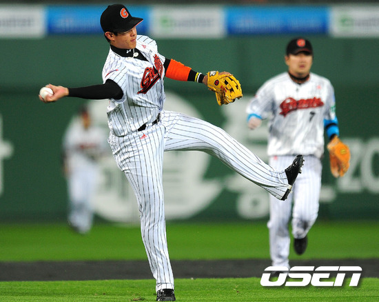2011 롯데카드 프로야구 플레이오프 2차전 롯데 3루수 황재균이 SK 김강민의 빗맞은 타구를 맨손으로 잡아 바로 송구 아웃을 잡고 있다. 17일 부산 사직구장에서 벌어진 플레이오프 2차전서 롯데는 양승호 감독이 예고한대로 송승준을 SK 이만수 감독은 고든을 각각 선발로 내세웠다. 송승준은 유독 SK에 시즌 내내 약세를 보여왔지만 양승호 감독은 선발로 밀어부치는 뚝심을 보여 결과가 어떻게 나올지 주목된다. 한편 1차전은 SK가 연장 10회 접전 끝에 롯데에 7-6의 기분좋은 역전승을 거두며 기선제압에 성공했다. 과연 2차전에서 송승준이 감독의 믿음에 부응, 위기의 팀을 구해 지긋지긋한 가을 악몽을 떨쳐낼지 아니면 SK 고든이 준플레이오프 상승세를 이어가며 2연승을 이끌지 관심이 집중된다. /spjj@osen.co.kr