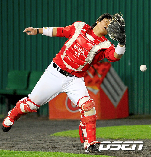 17일 오후 부산 사직구장서 열린 2011 롯데카드 프로야구 플레이오프 2차전 롯데 자이언츠와 SK 와이번스의 경기 2회말 무사 롯데 홍성흔의 파울타구를 SK 정상호 포수가 놓치고 있다. 플레이오프 2차전서 롯데는 양승호 감독이 예고한대로 송승준을 SK 이만수 감독은 고든을 각각 선발로 내세웠다. 송승준은 유독 SK에 시즌 내내 약세를 보여왔지만 양승호 감독은 선발로 밀어부치는 뚝심을 보여 결과가 어떻게 나올지 주목된다. 한편 1차전은 SK가 연장 10회 접전 끝에 롯데에 7-6의 기분좋은 역전승을 거두며 기선제압에 성공했다. 과연 2차전에서 송승준이 감독의 믿음에 부응, 위기의 팀을 구해 지긋지긋한 가을 악몽을 떨쳐낼지 아니면 SK 고든이 준플레이오프 상승세를 이어가며 2연승을 이끌지 관심이 집중된다 / soul1014@osen.co.kr