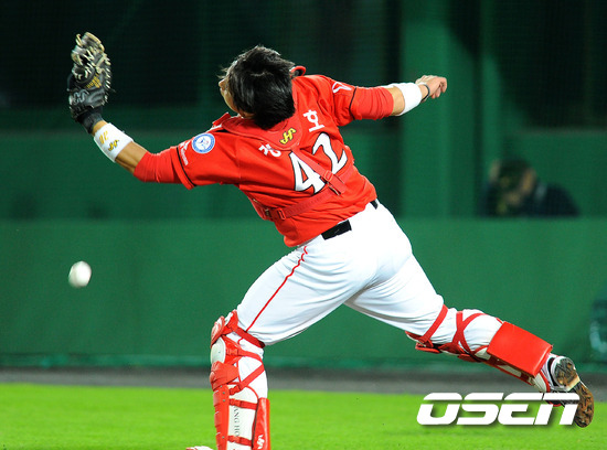 2011 롯데카드 프로야구 플레이오프 2차전 2회말 무사 SK 정상호가 롯데 홍성흔의 파울 타구를 놓치고 있다. 17일 부산 사직구장에서 벌어진 플레이오프 2차전서 롯데는 양승호 감독이 예고한대로 송승준을 SK 이만수 감독은 고든을 각각 선발로 내세웠다. 송승준은 유독 SK에 시즌 내내 약세를 보여왔지만 양승호 감독은 선발로 밀어부치는 뚝심을 보여 결과가 어떻게 나올지 주목된다. 한편 1차전은 SK가 연장 10회 접전 끝에 롯데에 7-6의 기분좋은 역전승을 거두며 기선제압에 성공했다. 과연 2차전에서 송승준이 감독의 믿음에 부응, 위기의 팀을 구해 지긋지긋한 가을 악몽을 떨쳐낼지 아니면 SK 고든이 준플레이오프 상승세를 이어가며 2연승을 이끌지 관심이 집중된다. / sunday@osen.co.kr