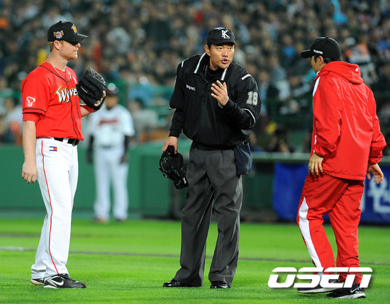 2011 롯데카드 프로야구 플레이오프 2차전 3회말 무사 SK 고든이 12초룰을 어기며 1차 경고를 받고 있다. 17일 부산 사직구장에서 벌어진 플레이오프 2차전서 롯데는 양승호 감독이 예고한대로 송승준을 SK 이만수 감독은 고든을 각각 선발로 내세웠다. 송승준은 유독 SK에 시즌 내내 약세를 보여왔지만 양승호 감독은 선발로 밀어부치는 뚝심을 보여 결과가 어떻게 나올지 주목된다. 한편 1차전은 SK가 연장 10회 접전 끝에 롯데에 7-6의 기분좋은 역전승을 거두며 기선제압에 성공했다. 과연 2차전에서 송승준이 감독의 믿음에 부응, 위기의 팀을 구해 지긋지긋한 가을 악몽을 떨쳐낼지 아니면 SK 고든이 준플레이오프 상승세를 이어가며 2연승을 이끌지 관심이 집중된다. / sunday@osen.co.kr