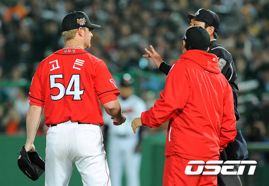 2011 롯데카드 프로야구 플레이오프 2차전 3회말 무사 SK 고든이 12초룰을 어기며 1차 경고를 받고 있다. 17일 부산 사직구장에서 벌어진 플레이오프 2차전서 롯데는 양승호 감독이 예고한대로 송승준을 SK 이만수 감독은 고든을 각각 선발로 내세웠다. 송승준은 유독 SK에 시즌 내내 약세를 보여왔지만 양승호 감독은 선발로 밀어부치는 뚝심을 보여 결과가 어떻게 나올지 주목된다. 한편 1차전은 SK가 연장 10회 접전 끝에 롯데에 7-6의 기분좋은 역전승을 거두며 기선제압에 성공했다. 과연 2차전에서 송승준이 감독의 믿음에 부응, 위기의 팀을 구해 지긋지긋한 가을 악몽을 떨쳐낼지 아니면 SK 고든이 준플레이오프 상승세를 이어가며 2연승을 이끌지 관심이 집중된다. / sunday@osen.co.kr