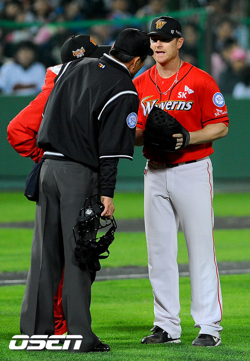 17일 오후 부산 사직구장서 열린 2011 롯데카드 프로야구 플레이오프 2차전 롯데 자이언츠와 SK 와이번스의 경기 3회말 SK 선발 고든이 12초룰 경고를 당하고 있다. 플레이오프 2차전서 롯데는 양승호 감독이 예고한대로 송승준을 SK 이만수 감독은 고든을 각각 선발로 내세웠다. 송승준은 유독 SK에 시즌 내내 약세를 보여왔지만 양승호 감독은 선발로 밀어부치는 뚝심을 보여 결과가 어떻게 나올지 주목된다. 한편 1차전은 SK가 연장 10회 접전 끝에 롯데에 7-6의 기분좋은 역전승을 거두며 기선제압에 성공했다. 과연 2차전에서 송승준이 감독의 믿음에 부응, 위기의 팀을 구해 지긋지긋한 가을 악몽을 떨쳐낼지 아니면 SK 고든이 준플레이오프 상승세를 이어가며 2연승을 이끌지 관심이 집중된다 / soul1014@osen.co.kr