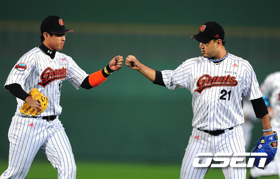 2011 롯데카드 프로야구 플레이오프 2차전 SK 4회초 1사 1루 이호준을 병살로 처리한 황재균과 송승준이 주먹을 마주 치고 있다. 17일 부산 사직구장에서 벌어진 플레이오프 2차전서 롯데는 양승호 감독이 예고한대로 송승준을 SK 이만수 감독은 고든을 각각 선발로 내세웠다. 송승준은 유독 SK에 시즌 내내 약세를 보여왔지만 양승호 감독은 선발로 밀어부치는 뚝심을 보여 결과가 어떻게 나올지 주목된다. 한편 1차전은 SK가 연장 10회 접전 끝에 롯데에 7-6의 기분좋은 역전승을 거두며 기선제압에 성공했다. 과연 2차전에서 송승준이 감독의 믿음에 부응, 위기의 팀을 구해 지긋지긋한 가을 악몽을 떨쳐낼지 아니면 SK 고든이 준플레이오프 상승세를 이어가며 2연승을 이끌지 관심이 집중된다. /spjj@osen.co.kr