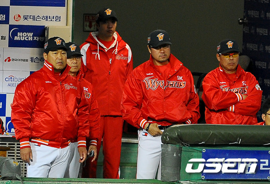17일 오후 부산 사직구장서 열린 2011 롯데카드 프로야구 플레이오프 2차전 롯데 자이언츠와 SK 와이번스의 경기 5회말 롯데 문규현의 타석때 SK 이만수 감독대행과 코칭스태프들이 서서 경기를 지켜보고 있다. 플레이오프 2차전서 롯데는 양승호 감독이 예고한대로 송승준을 SK 이만수 감독은 고든을 각각 선발로 내세웠다. 송승준은 유독 SK에 시즌 내내 약세를 보여왔지만 양승호 감독은 선발로 밀어부치는 뚝심을 보여 결과가 어떻게 나올지 주목된다. 한편 1차전은 SK가 연장 10회 접전 끝에 롯데에 7-6의 기분좋은 역전승을 거두며 기선제압에 성공했다. 과연 2차전에서 송승준이 감독의 믿음에 부응, 위기의 팀을 구해 지긋지긋한 가을 악몽을 떨쳐낼지 아니면 SK 고든이 준플레이오프 상승세를 이어가며 2연승을 이끌지 관심이 집중된다 / soul1014@osen.co.kr