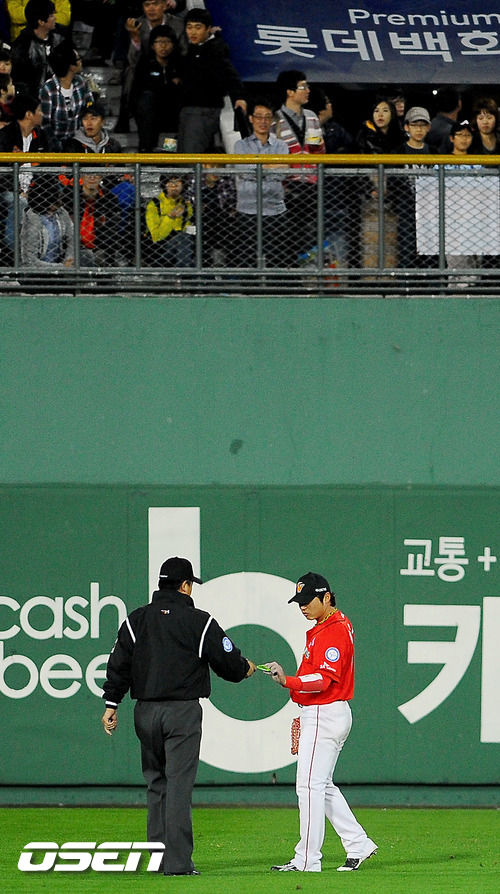 17일 오후 부산 사직구장서 열린 2011 롯데카드 프로야구 플레이오프 2차전 롯데 자이언츠와 SK 와이번스의 경기 5회말 관중석에서 이물질 투척으로 경기가 중단되고 있다. 플레이오프 2차전서 롯데는 양승호 감독이 예고한대로 송승준을 SK 이만수 감독은 고든을 각각 선발로 내세웠다. 송승준은 유독 SK에 시즌 내내 약세를 보여왔지만 양승호 감독은 선발로 밀어부치는 뚝심을 보여 결과가 어떻게 나올지 주목된다. 한편 1차전은 SK가 연장 10회 접전 끝에 롯데에 7-6의 기분좋은 역전승을 거두며 기선제압에 성공했다. 과연 2차전에서 송승준이 감독의 믿음에 부응, 위기의 팀을 구해 지긋지긋한 가을 악몽을 떨쳐낼지 아니면 SK 고든이 준플레이오프 상승세를 이어가며 2연승을 이끌지 관심이 집중된다 / soul1014@osen.co.kr