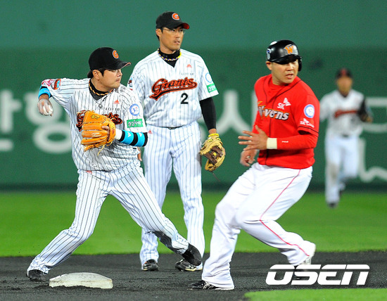2011 롯데카드 프로야구 플레이오프 2차전 6회초 무사 1루 SK 정근우의 병살타때 롯데 문규현이 2루를 아웃으로 처리하고 1루로 송구하고 있다. 17일 부산 사직구장에서 벌어진 플레이오프 2차전서 롯데는 양승호 감독이 예고한대로 송승준을 SK 이만수 감독은 고든을 각각 선발로 내세웠다. 송승준은 유독 SK에 시즌 내내 약세를 보여왔지만 양승호 감독은 선발로 밀어부치는 뚝심을 보여 결과가 어떻게 나올지 주목된다. 한편 1차전은 SK가 연장 10회 접전 끝에 롯데에 7-6의 기분좋은 역전승을 거두며 기선제압에 성공했다. 과연 2차전에서 송승준이 감독의 믿음에 부응, 위기의 팀을 구해 지긋지긋한 가을 악몽을 떨쳐낼지 아니면 SK 고든이 준플레이오프 상승세를 이어가며 2연승을 이끌지 관심이 집중된다. / sunday@osen.co.kr