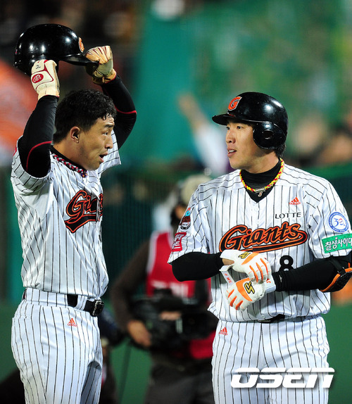 2011 롯데카드 프로야구 플레이오프 2차전 6회말 1사 1루 전준우가 투런 홈런을 치고 동료들의 환영을 받고 있다. 17일 부산 사직구장에서 벌어진 플레이오프 2차전서 롯데는 양승호 감독이 예고한대로 송승준을 SK 이만수 감독은 고든을 각각 선발로 내세웠다. 송승준은 유독 SK에 시즌 내내 약세를 보여왔지만 양승호 감독은 선발로 밀어부치는 뚝심을 보여 결과가 어떻게 나올지 주목된다. 한편 1차전은 SK가 연장 10회 접전 끝에 롯데에 7-6의 기분좋은 역전승을 거두며 기선제압에 성공했다. 과연 2차전에서 송승준이 감독의 믿음에 부응, 위기의 팀을 구해 지긋지긋한 가을 악몽을 떨쳐낼지 아니면 SK 고든이 준플레이오프 상승세를 이어가며 2연승을 이끌지 관심이 집중된다. /spjj@osen.co.kr