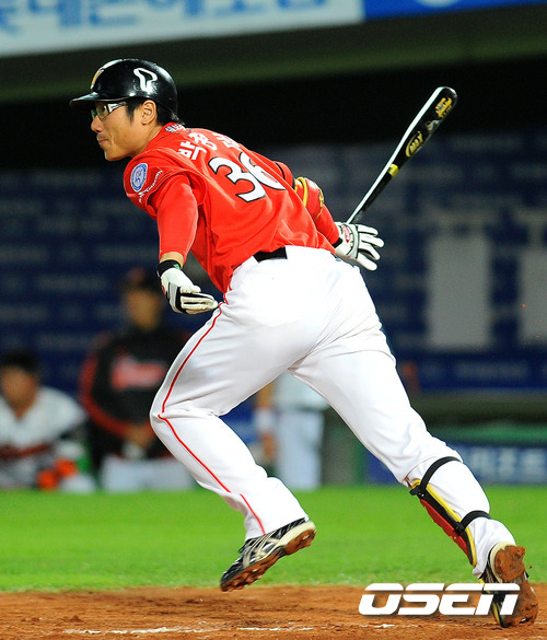 2011 롯데카드 프로야구 플레이오프 2차전 7회초 무사 1,2루 SK 박정권이 1타점 적시타를 치고 있다. 17일 부산 사직구장에서 벌어진 플레이오프 2차전서 롯데는 양승호 감독이 예고한대로 송승준을 SK 이만수 감독은 고든을 각각 선발로 내세웠다. 송승준은 유독 SK에 시즌 내내 약세를 보여왔지만 양승호 감독은 선발로 밀어부치는 뚝심을 보여 결과가 어떻게 나올지 주목된다. 한편 1차전은 SK가 연장 10회 접전 끝에 롯데에 7-6의 기분좋은 역전승을 거두며 기선제압에 성공했다. 과연 2차전에서 송승준이 감독의 믿음에 부응, 위기의 팀을 구해 지긋지긋한 가을 악몽을 떨쳐낼지 아니면 SK 고든이 준플레이오프 상승세를 이어가며 2연승을 이끌지 관심이 집중된다. / sunday@osen.co.kr