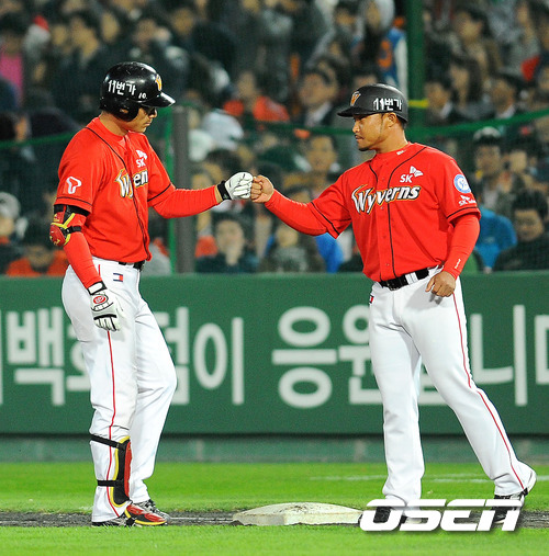 2011 롯데카드 프로야구 플레이오프 2차전 7회초 무사 1,2루 SK 박정권이 1타점 적시타를 치고 정경배 코치와 하이파이브를 하고 있다. 17일 부산 사직구장에서 벌어진 플레이오프 2차전서 롯데는 양승호 감독이 예고한대로 송승준을 SK 이만수 감독은 고든을 각각 선발로 내세웠다. 송승준은 유독 SK에 시즌 내내 약세를 보여왔지만 양승호 감독은 선발로 밀어부치는 뚝심을 보여 결과가 어떻게 나올지 주목된다. 한편 1차전은 SK가 연장 10회 접전 끝에 롯데에 7-6의 기분좋은 역전승을 거두며 기선제압에 성공했다. 과연 2차전에서 송승준이 감독의 믿음에 부응, 위기의 팀을 구해 지긋지긋한 가을 악몽을 떨쳐낼지 아니면 SK 고든이 준플레이오프 상승세를 이어가며 2연승을 이끌지 관심이 집중된다. / sunday@osen.co.kr