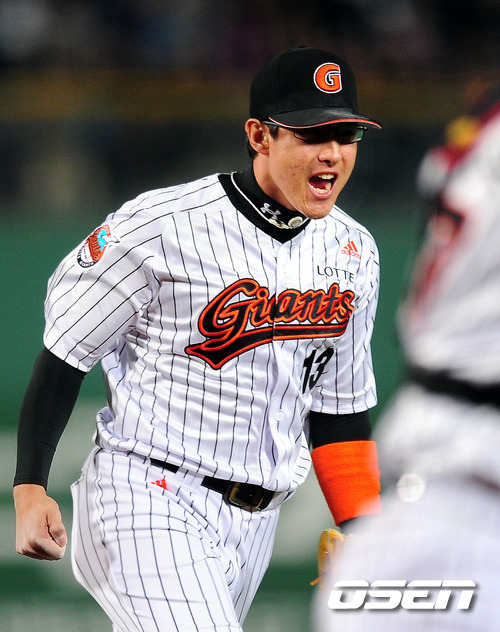2011 롯데카드 프로야구 플레이오프 2차전 7회초 2사 2,3루 SK 정상호의 빗맞은 타구를 롯데 3루수 황재균이 맨손으로 잡아 송구 아웃, 위기를 탈출한 후 환호하고 있다. 17일 부산 사직구장에서 벌어진 플레이오프 2차전서 롯데는 양승호 감독이 예고한대로 송승준을 SK 이만수 감독은 고든을 각각 선발로 내세웠다. 송승준은 유독 SK에 시즌 내내 약세를 보여왔지만 양승호 감독은 선발로 밀어부치는 뚝심을 보여 결과가 어떻게 나올지 주목된다. 한편 1차전은 SK가 연장 10회 접전 끝에 롯데에 7-6의 기분좋은 역전승을 거두며 기선제압에 성공했다. 과연 2차전에서 송승준이 감독의 믿음에 부응, 위기의 팀을 구해 지긋지긋한 가을 악몽을 떨쳐낼지 아니면 SK 고든이 준플레이오프 상승세를 이어가며 2연승을 이끌지 관심이 집중된다. /spjj@osen.co.kr