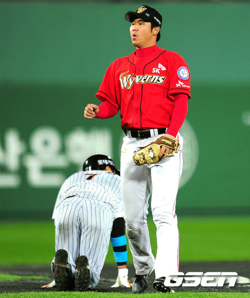 2011 롯데카드 프로야구 플레이오프 2차전 7회초말 2사 1,2루 전준우의 내야안타때 2루주자 문규현이 3루를 오버런 최정에게 태그아웃 되고 있다. 17일 부산 사직구장에서 벌어진 플레이오프 2차전서 롯데는 양승호 감독이 예고한대로 송승준을 SK 이만수 감독은 고든을 각각 선발로 내세웠다. 송승준은 유독 SK에 시즌 내내 약세를 보여왔지만 양승호 감독은 선발로 밀어부치는 뚝심을 보여 결과가 어떻게 나올지 주목된다. 한편 1차전은 SK가 연장 10회 접전 끝에 롯데에 7-6의 기분좋은 역전승을 거두며 기선제압에 성공했다. 과연 2차전에서 송승준이 감독의 믿음에 부응, 위기의 팀을 구해 지긋지긋한 가을 악몽을 떨쳐낼지 아니면 SK 고든이 준플레이오프 상승세를 이어가며 2연승을 이끌지 관심이 집중된다. /spjj@osen.co.kr