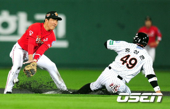 2011 롯데카드 프로야구 플레이오프 2차전 롯데 6회말 2사 1루 홍성흔이 도루에 성공하고 있다. 17일 부산 사직구장에서 벌어진 플레이오프 2차전서 롯데는 양승호 감독이 예고한대로 송승준을 SK 이만수 감독은 고든을 각각 선발로 내세웠다. 송승준은 유독 SK에 시즌 내내 약세를 보여왔지만 양승호 감독은 선발로 밀어부치는 뚝심을 보여 결과가 어떻게 나올지 주목된다. 한편 1차전은 SK가 연장 10회 접전 끝에 롯데에 7-6의 기분좋은 역전승을 거두며 기선제압에 성공했다. 과연 2차전에서 송승준이 감독의 믿음에 부응, 위기의 팀을 구해 지긋지긋한 가을 악몽을 떨쳐낼지 아니면 SK 고든이 준플레이오프 상승세를 이어가며 2연승을 이끌지 관심이 집중된다. /spjj@osen.co.kr